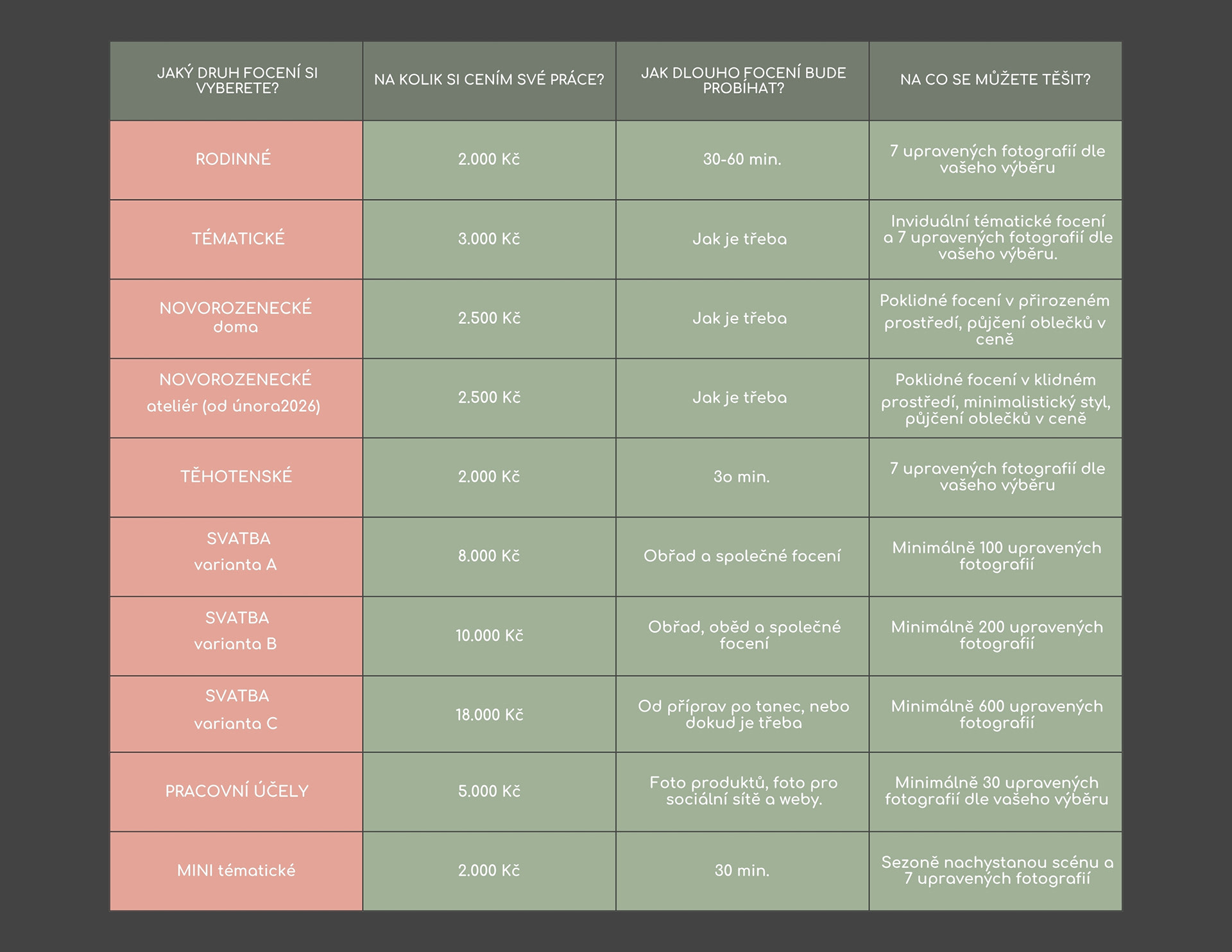 cena konkrétních typů fotografování včetně podrobné informace o tom, co je součástí jednotlivých balíčků je podrobně uvedena na WEBOVÝCH STRÁNKÁCH